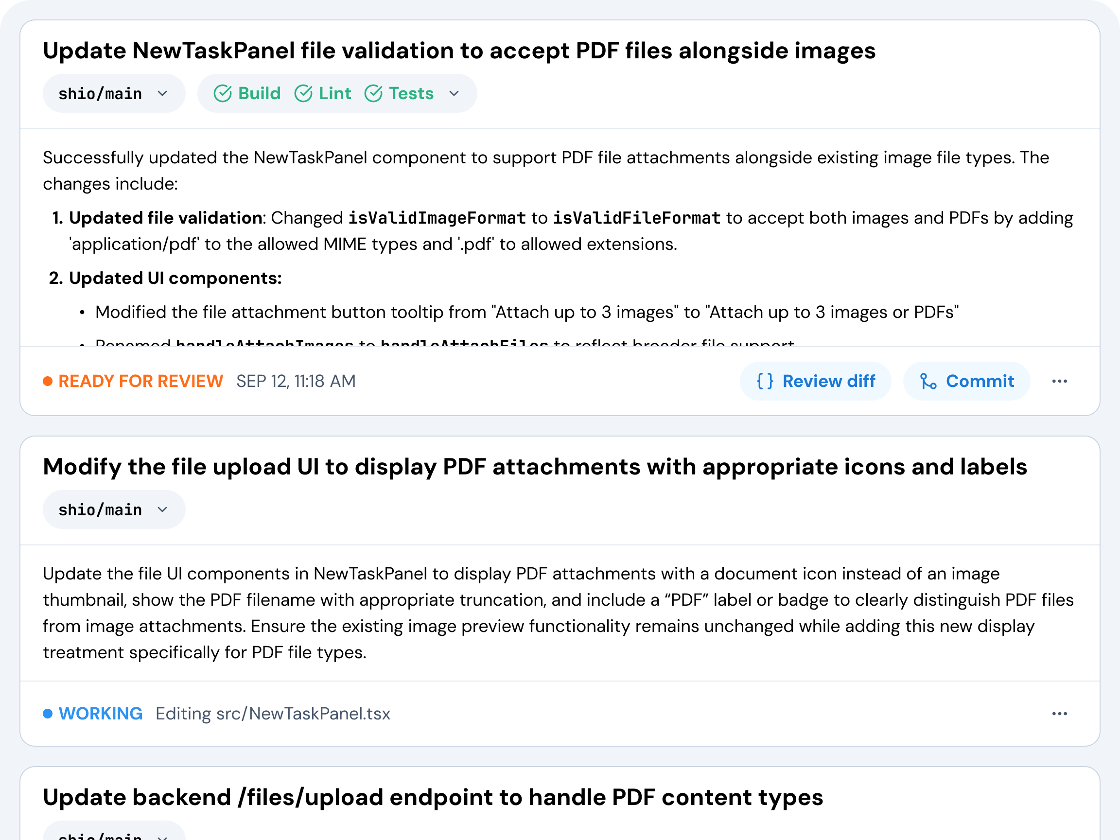 Review diffs, give feedback, and get instant turnaround. No commits are made until you say so.