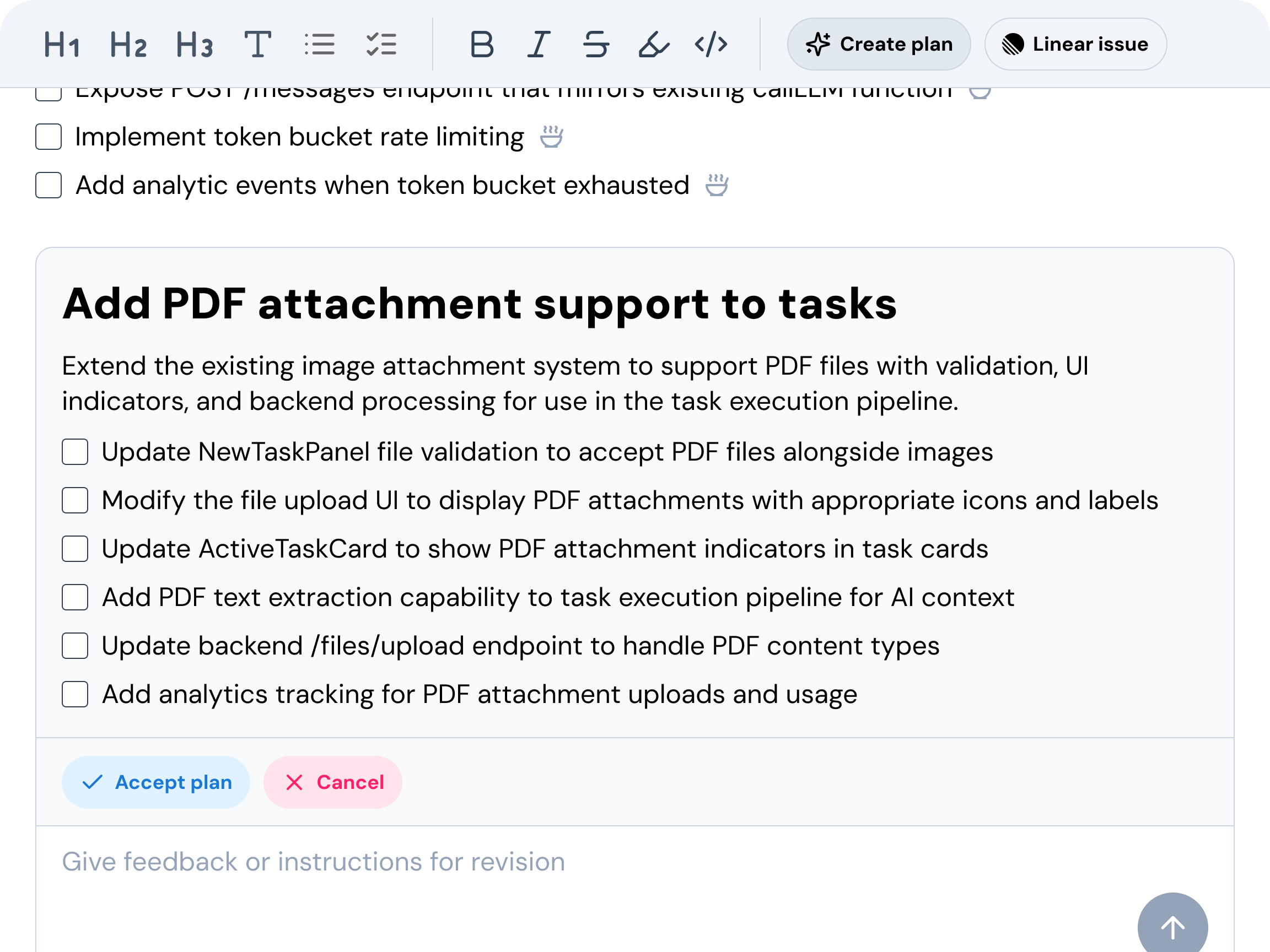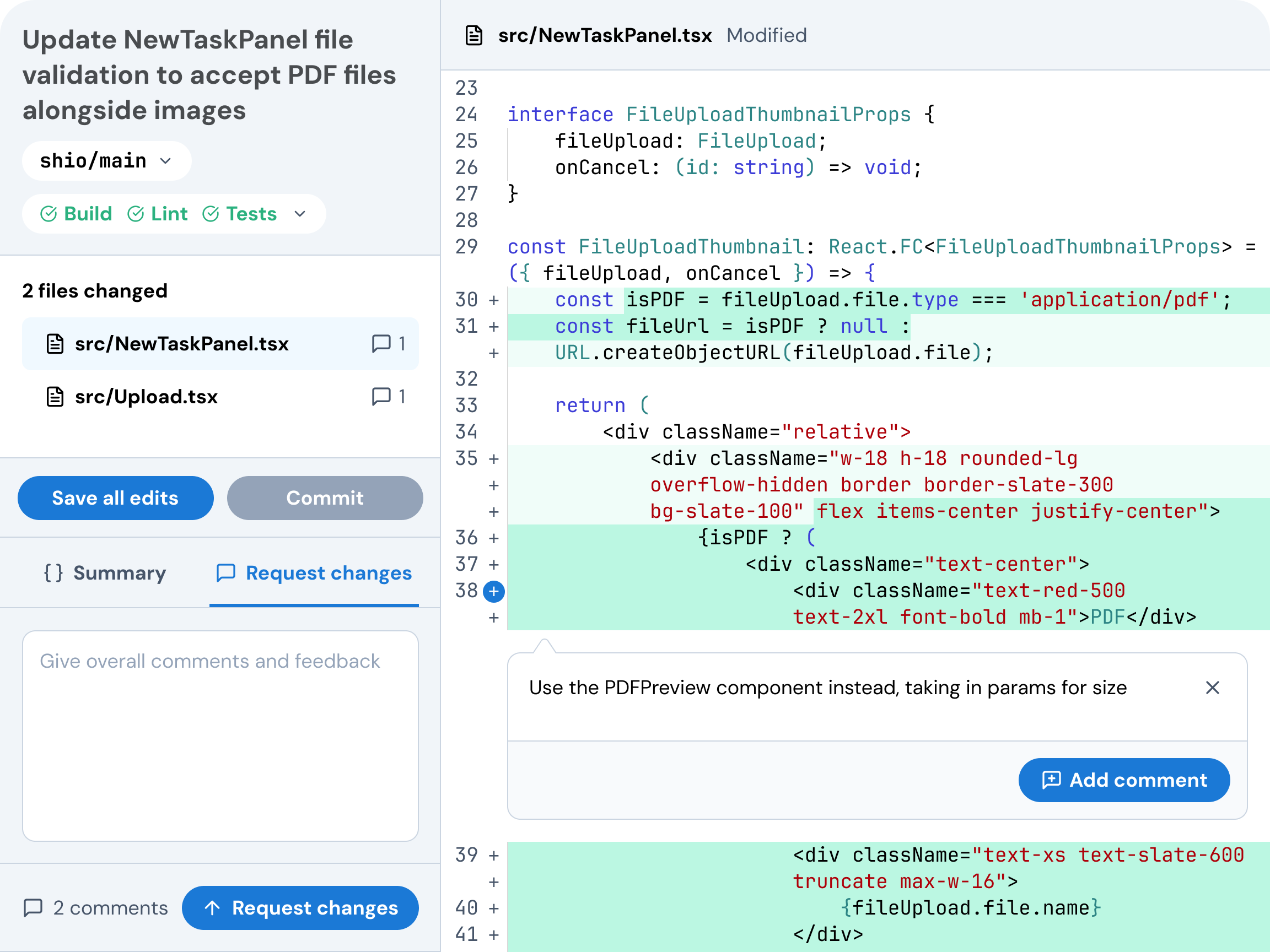 Review diffs, give feedback, and get instant turnaround. No commits are made until you say so.
